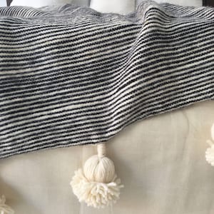 Hand woven from handspun wool finished with extra large Pom Poms sewn along 2 sides of the blankets. Made in traditional Moroccan style these bankets are extremely warm and contain natural variations adding to the already chic aesthetic.